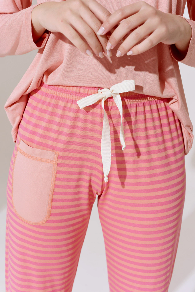Conjunto de remera manga larga y pantalón. Línea cómoda que representa el concepto de la marca “homewear”. Para uso de entrecasa y para dormir.
